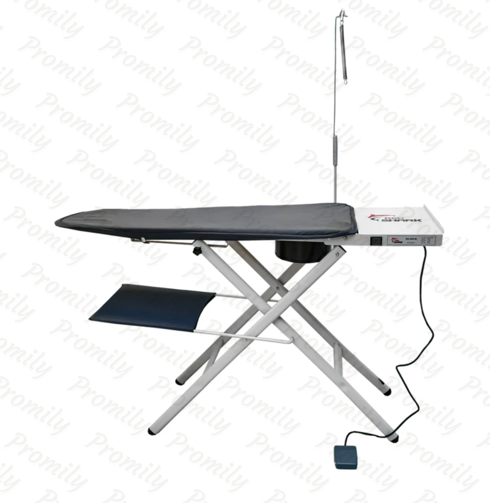 Регулируется по высоте в 3-х положениях, с вакумным отсосом и электрическим подогревом рабочей поверхности. Укомплектованна крепежом и антеной для поддержания электро и парашланга, у доски имеется полноценная подставка для парогенератора, а так же полочка для готовых изделий.